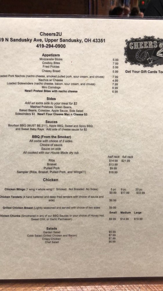 Introducing "Cheers2U," a vibrant New American bar located in Upper Sandusky, OH, at 119 N Sandusky Ave. This unclaimed gem invites food lovers to indulge in a diverse menu boasting mouthwatering appetizers and savory BBQ selections.